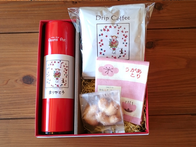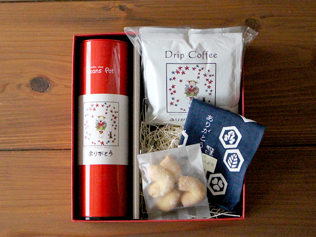 『ありがとう』の気持ちを伝えるのに最適な「ありがとうブレンド」の自家焙煎珈琲とドリップカフェ、日本手ぬぐいで出来た上品で遊び心のある「ひとことハンカチ」とバニラキッフェルをセットにしました。